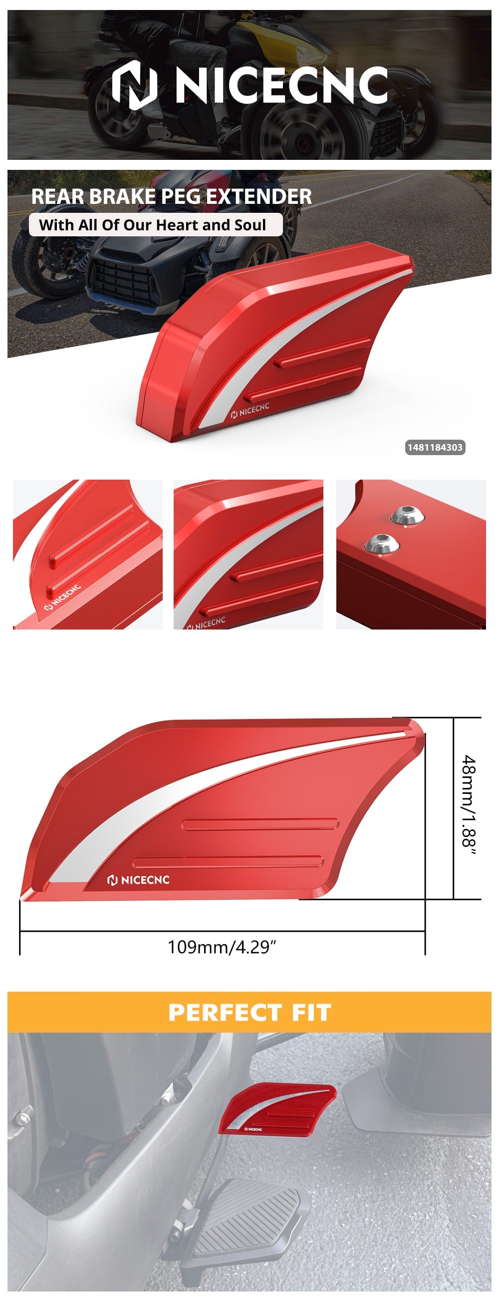 NICECNC Larger Brake Pedal was made of aviation-grade 6061 aluminum alloy, which will Extend the rear brake pedal, providing improved control and a more comfortable ride. The anodized surface treatment enhances the appearance texture, prevents corrosion and rust. The process is CNC-milled and customized for Can Am Ryker to match the overall style.